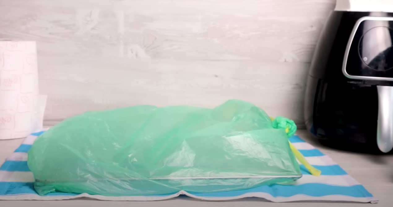 -Mezclar bien, asegurándose de que todo se disuelva bien. Una vez hecho esto, vierte la mezcla en la bolsa de plástico con las rejillas. Ate bien la bolsa para cerrarla y luego colóquela sobre una superficie plana forrada con una toalla.