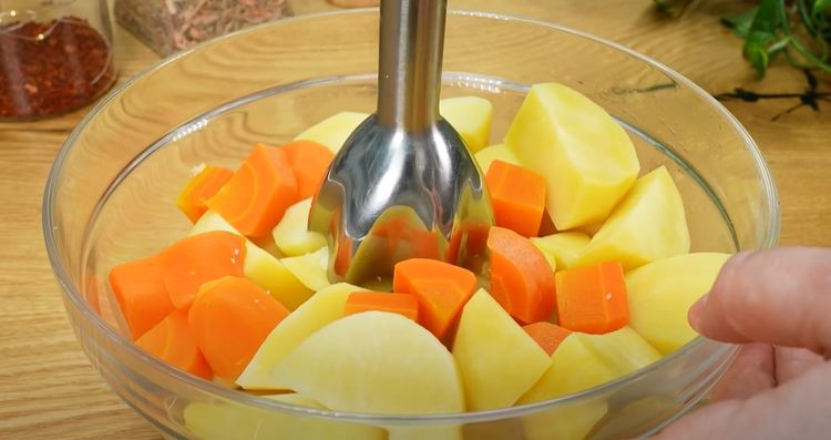 -Tritura y mezcla: Tritura las patatas y la zanahoria cocidas con un prensapuré o batidora hasta obtener una mezcla homogénea. En un bol grande, mezcla este puré con la cebolla dorada. Añade el huevo (o dos, si lo prefieres), la sal, la nuez moscada, la mejorana y la pimienta negra. Mezcla bien e incorpora el pan rallado poco a poco hasta que la masa sea firme.