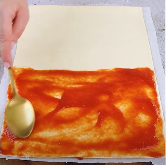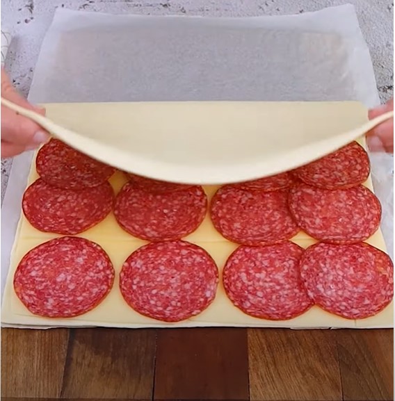 Repite el proceso con la segunda lámina de hojaldre, esta vez rellenándola con queso y rodajas de salamín. Dobla y corta en cuadrados, llevando a la heladera por 10 minutos.
