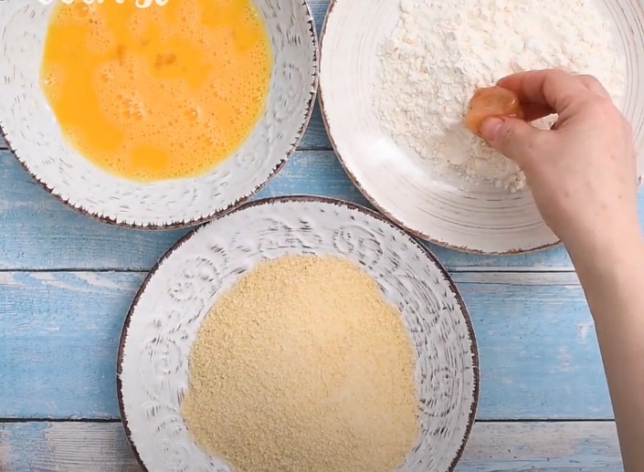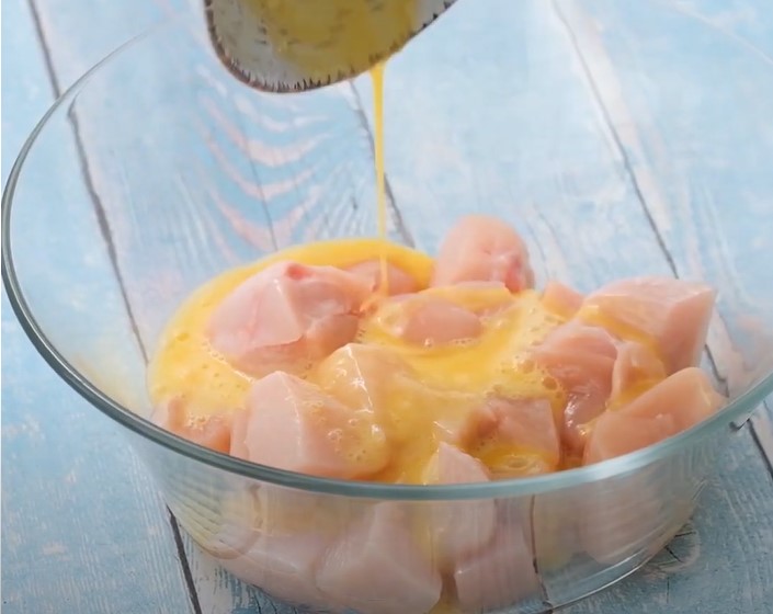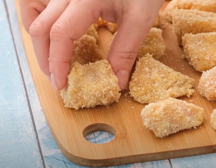 -Empaniza el Pollo: Escurre el exceso de líquido de los cubos de pollo. Pasa cada cubo por harina de trigo, luego por los huevos batidos y finalmente por la mezcla de pan rallado y queso parmesano. Asegúrate de que cada cubo quede bien cubierto.