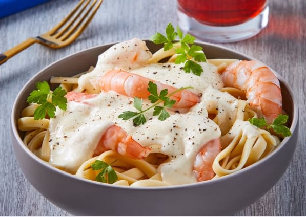 La salsa Alfredo, con su base de mantequilla, nata (crema de leche) y queso parmesano, proporciona un sabor rico, indulgente y profundamente satisfactorio. La cremosidad de la salsa se infunde con los jugosos camarones, creando una sinfonía de sabores que deleitan el paladar en cada bocado.