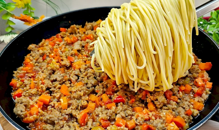 -¡Hora de combinar! Escurre los espaguetis cocidos y añádelos a la sartén con la deliciosa salsa de carne. Deja que reposen unos minutos para que absorban todos los sabores.