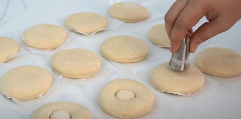 -Formar las donas: Una vez que la masa haya subido, ponla sobre una superficie enharinada y estírala con un rodillo hasta que tenga un grosor de aproximadamente 1 cm. Usa un cortador de donas o dos cortadores circulares de diferentes tamaños para formar las donas y sus agujeros. Coloca las donas en una bandeja de horno forrada con papel pergamino.