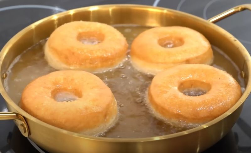 -Freír las donas: Calienta el aceite en una sartén grande a unos 180°C (350°F). Fríe las donas en pequeñas tandas, aproximadamente 1-2 minutos por cada lado, hasta que estén doradas. Usa una espumadera para darles la vuelta y sacarlas del aceite. Coloca las donas sobre papel absorbente para eliminar el exceso de aceite.