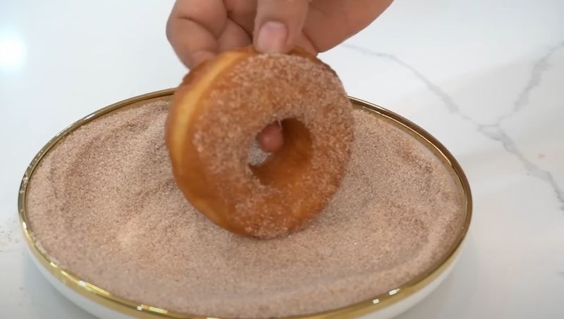 -Cubrir las donas: Mientras las donas aún están calientes, pásalas por la mezcla de azúcar para cubrirlas completamente.