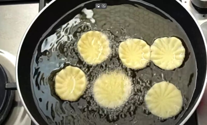 Calienta el aceite vegetal en una cacerola profunda a temperatura media. Coloca las galletas en el aceite caliente y fríe hasta que estén doradas y crujientes por fuera.