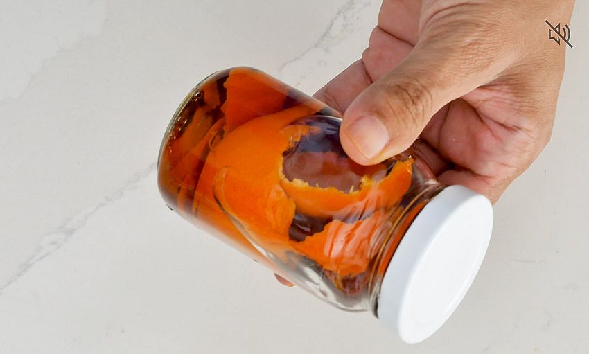 -Agrega las cáscaras de mandarina maceradas en alcohol a la mezcla de jarabe, y déjalo reposar durante diez minutos.