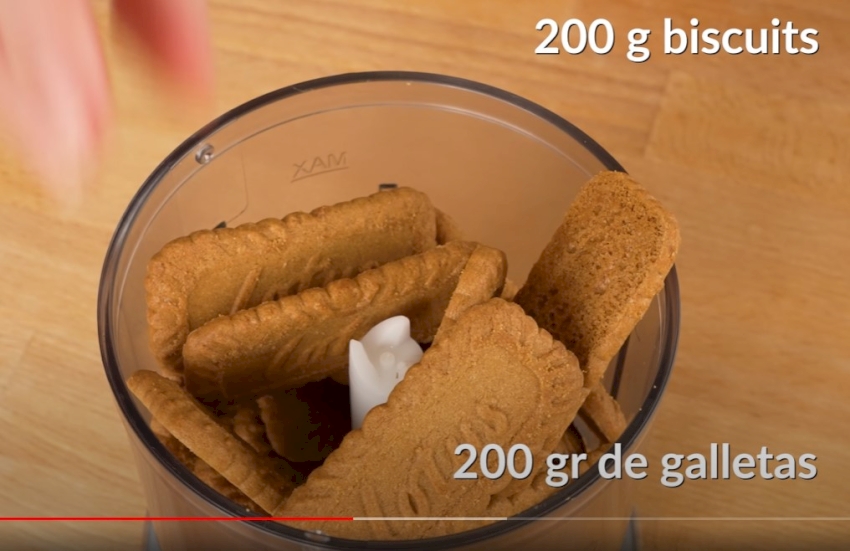 -En un procesador de alimentos trituramos 200 gramos de galletas hasta obtener migajas finas. Utilizamos estas migajas como base en recipientes individuales. En otro bol, batimos bien 400 gramos de queso crema con 180 gramos de azúcar.
