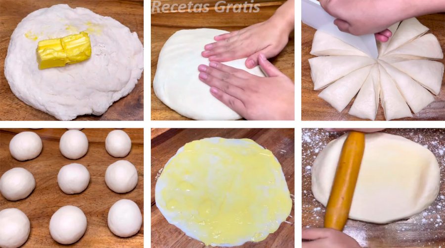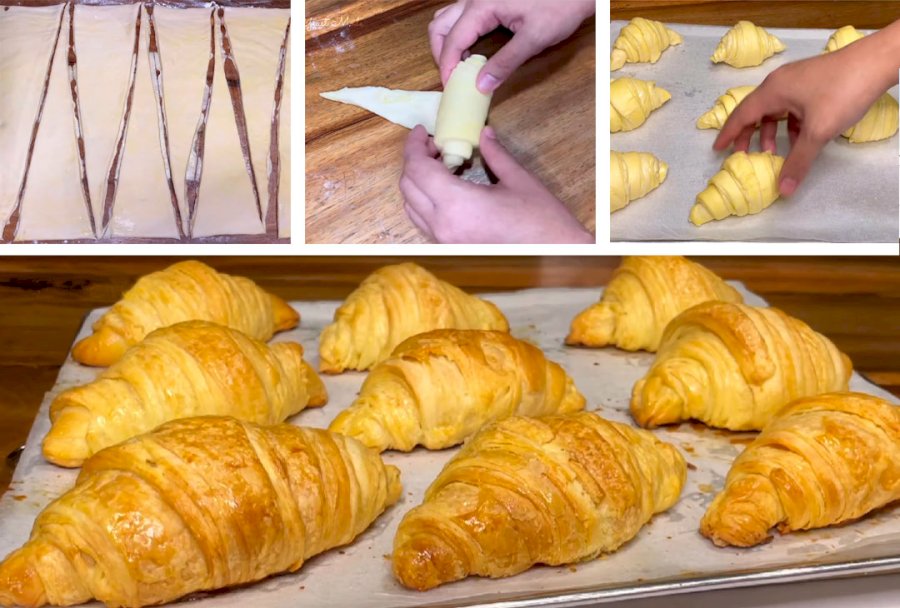 – Extiende la masa en un rectángulo y corta triángulos. Luego, enrolla cada triángulo desde la base hacia la punta para formar los croissants.