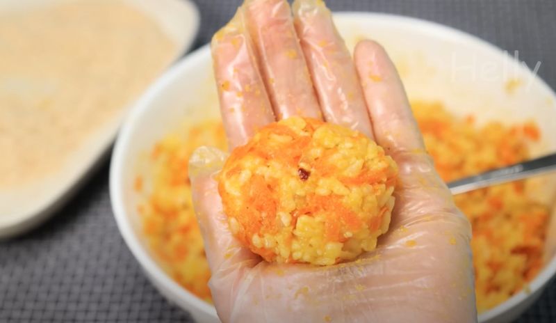 - Forma bolas con la mezcla de arroz, usando una cuchara o las manos, y aplana cada bola para darles forma de empanada.