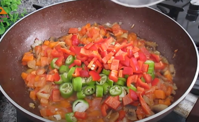 Espera que el tomate suelte todo su jugo y que este se evapore. Una vez que esto suceda, añade el pimiento verde picadito y también el pimiento rojo. Rehoga para que se vayan cocinando e integrando todos los sabores.