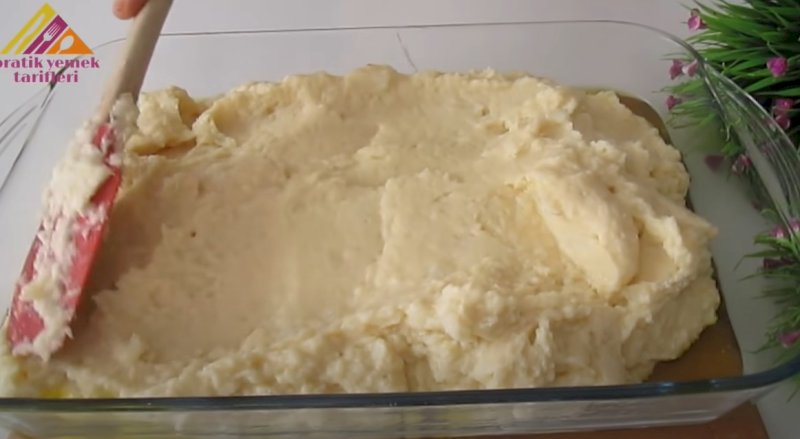 Para armar este delicioso plato con la coliflor como protagonista, pincela un molde rectangular con 4 cucharadas de aceite. Pincela bien el fondo del molde y también los laterales. Pon el puré de coliflor en el molde y con la ayuda de una espátula de silicona o con un cuchillo, distribúyelo de manera uniforme y empareja la superficie.