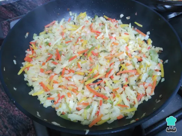 -Pela y pica la cebolla, luego colócala en una sartén a fuego medio-bajo con un chorrito de aceite de oliva. Añade las verduras cortadas en juliana a tu gusto y sofríe todo junto hasta que esté bien cocido.