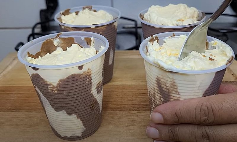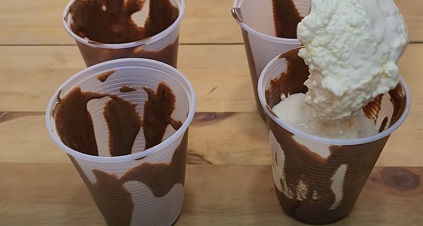 -Preparar los vasos: Antes de verter el helado, coloca una capa de calda de chocolate en el borde interno de cada vaso. Deja que se enfríe un poco y se endurezca antes de añadir el helado.