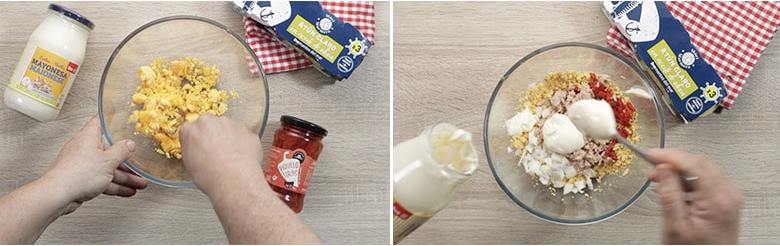 Picamos muy fina la cebolla y el pimiento desmenuzamos el atún. Lo mezclamos todo y añadimos la mayonesa ligando todo el relleno.