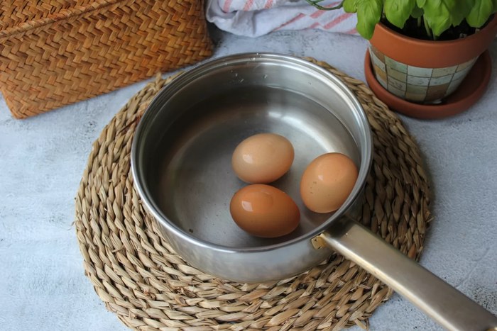 Lo primero que vamos a hacer será poner a cocer los huevos. Pondremos los huevos dentro de un cazo y los cubriremos con agua. Llevamos a ebullición y en cuanto rompa a hervir contamos 10 minutos. Pasado ese tiempo echamos los huevos en un recipiente con agua fría para cortar la cocción. Con esto también conseguiremos que pelar los huevos sea una tarea mucho más sencilla.