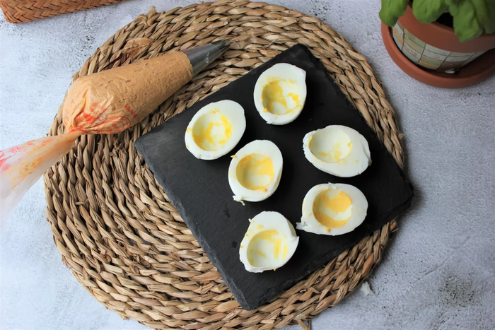 - Cortamos longitudinalmente los huevos y retiramos la yema