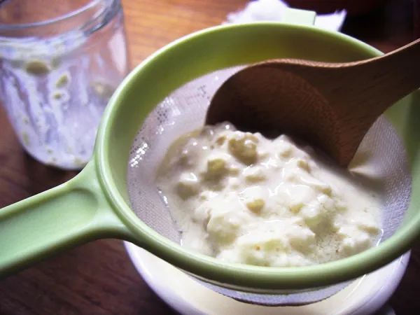 -Pasadas las 24 horas, coge el tarro y cuela la leche. Recuerda que el colador no puede ser metálico. Con la ayuda de una espátula (de plástico o similar), remueve el hongo para que pueda colarse bien y extraer todo el líquido. El líquido que se extrae es el kéfir de leche, de manera que deberás ponerlo en otro tarro de cristal.