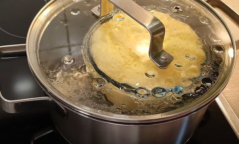 3️⃣ Cocción al baño maría: Vierte la mezcla en un molde resistente al calor y colócalo en una sartén con agua caliente. Tapa la sartén y cocina a fuego medio-alto durante 20 minutos, hasta que la tortilla esté esponjosa y firme en el centro.