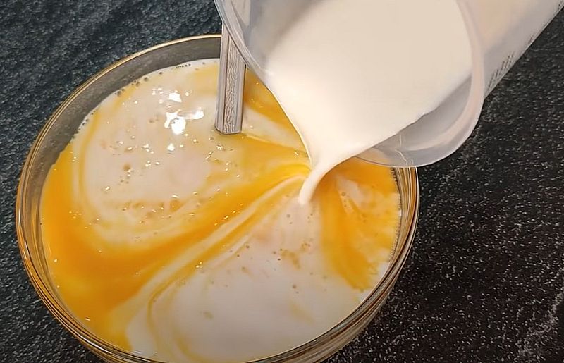 2️⃣ Añade la leche: Vierte 250 ml de leche a temperatura ambiente en la mezcla de huevo. Remueve todo hasta que quede bien integrado. Añade una pizca de sal y las especias o hierbas que más te gusten.
