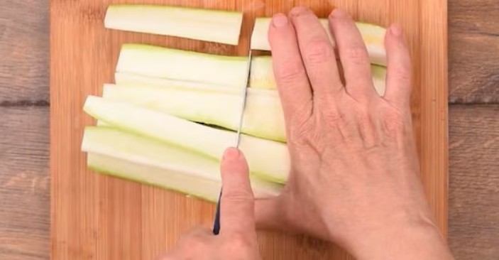 ✅ Corta y deshidrata: lava los calabacines y córtalos en palitos uniformes. Espolvorea sal, deja 10 minutos en un colador y sécalos con papel de cocina para retirar el exceso de agua.