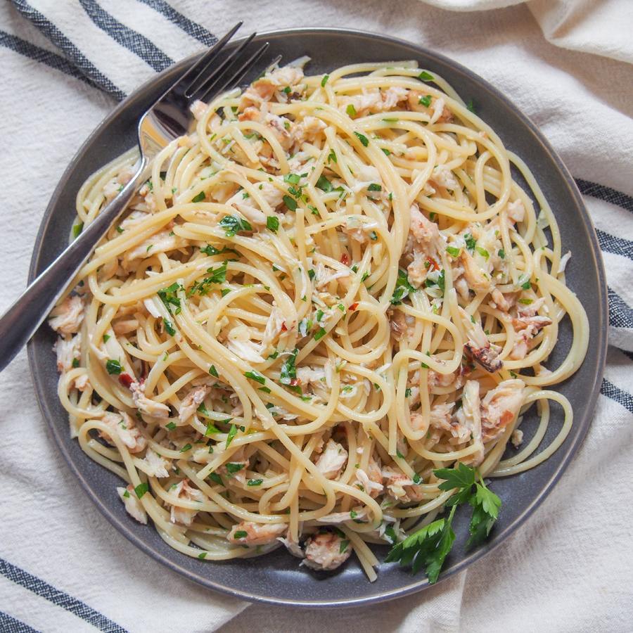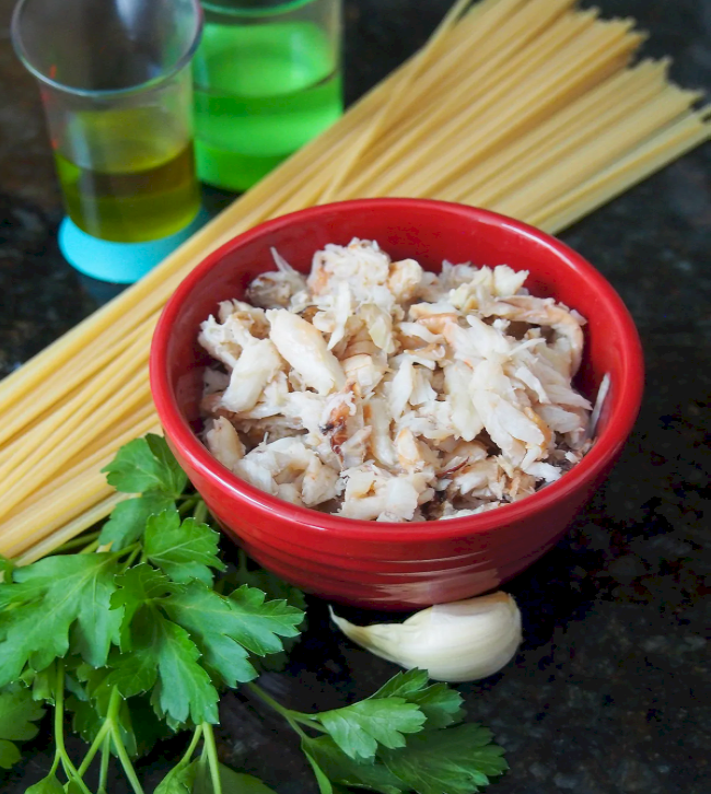 -Levante la pasta de su olla con pinzas directamente en la sartén con el aceite de ajo y revuelva suavemente para cubrir la pasta con el aceite. Añadimos el perejil y el cangrejo y mezclamos para que quede todo bien repartido por la pasta. Agregue un poco más de aceite o un poco del agua de cocción, si es necesario, para aflojarlo.