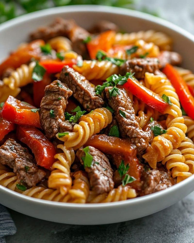 Devuelve el bistec a la sartén y mezcla bien con la salsa. Agrega la pasta cocida y revuelve hasta que todo esté bien combinado y caliente.