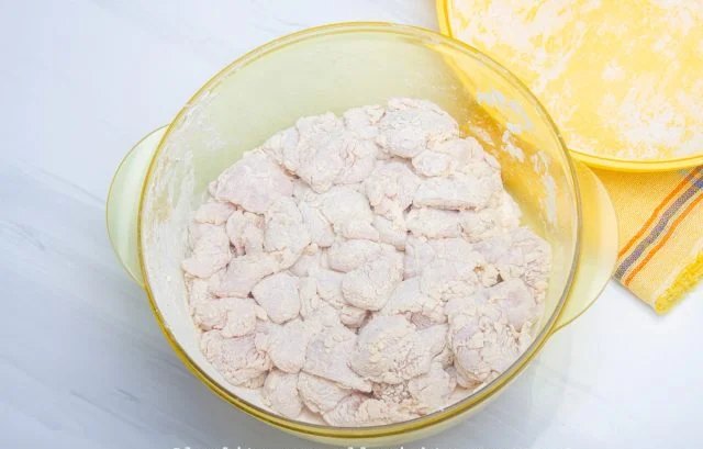 Paso 1: Preparación del pollo: Corta las pechugas de pollo en trozos pequeños y sazónalos con sal y pimienta al gusto. Posteriormente, pasa cada trozo primero por maicena y luego por el huevo batido, asegurándote de que queden bien cubiertos.