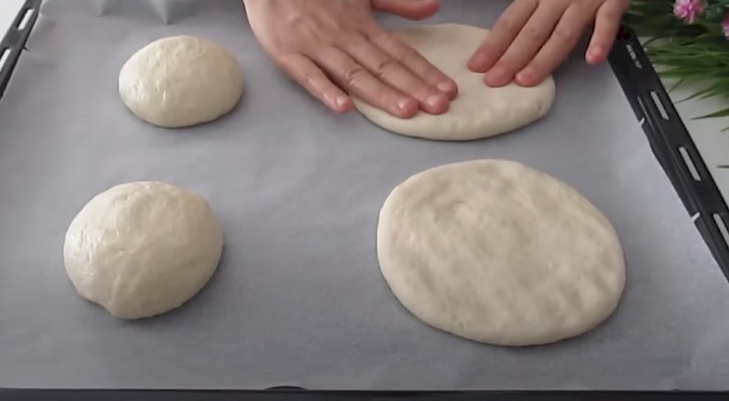 -Presiona cada bollo con la mano para aplanarlos ligeramente. Pincela cada disco resultante con el huevo batido.