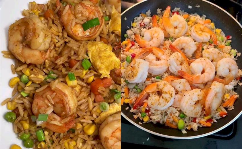 Los camarones se saltean con ajo y jengibre hasta que estén tiernos y luego se retiran de la sartén. A continuación, se saltean los vegetales, como cebolla, pimiento y zanahorias, hasta que estén tiernos pero crujientes. El arroz se agrega a la sartén y se mezcla con los vegetales, sazonado con salsa de soja y otros condimentos al gusto.