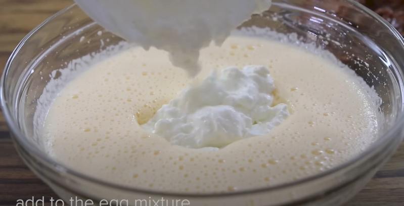 2. En un tazón grande, bata los huevos y el azúcar, hasta que duplique su volumen, aproximadamente 5-6 minutos. En un recipiente aparte, revuelva la crema agria con bicarbonato de sodio, luego agréguela a la mezcla de huevo y bata hasta que se incorpore. Agrega el dulce de leche y bate hasta que se incorpore.