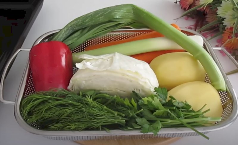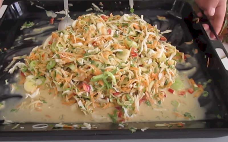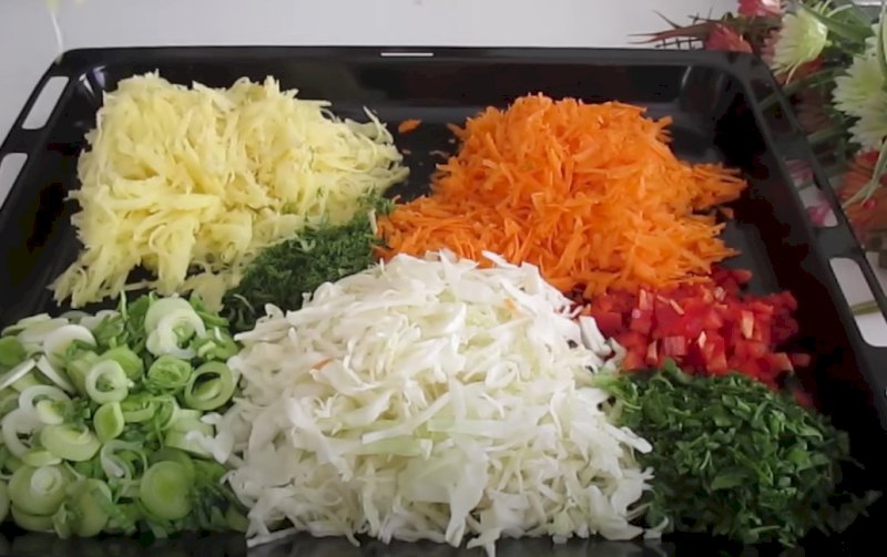 -Preparación de las Verduras: En primer lugar, coloca en una grasera el puerro cortado en rodajas, añade la col picada, el eneldo picado, el perejil picado, el pimiento cortado en cubitos, las zanahorias y las patatas peladas y ralladas (crudas).