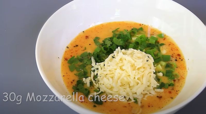 -Añade las hierbas y el queso: Incorpora el perejil, la cebolla verde y el queso mozzarella a la mezcla de huevo. Remueve hasta que todos los ingredientes estén bien combinados.