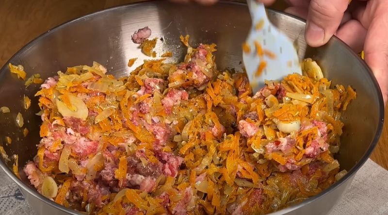 -Mezcla la carne molida con sal, pimienta y perejil al gusto. Añade la cebolla y zanahoria sofritas, el arroz y el repollo enfriado.