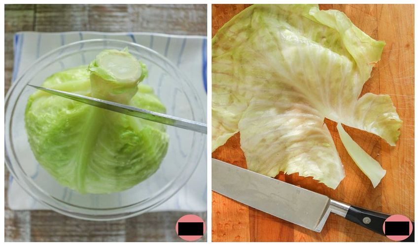-Preparar las hojas de repollo: Una vez que el repollo esté lo suficientemente frío para manejar, retira las hojas con cuidado y corta el tronco de cada hoja. A medida que comiences a quitar las hojas, probablemente necesitarás volver a poner el repollo en el agua hirviendo para ablandar más hojas. Solo hierve un poco más, deja enfriar lo suficiente para manejar y sigue quitando las hojas.