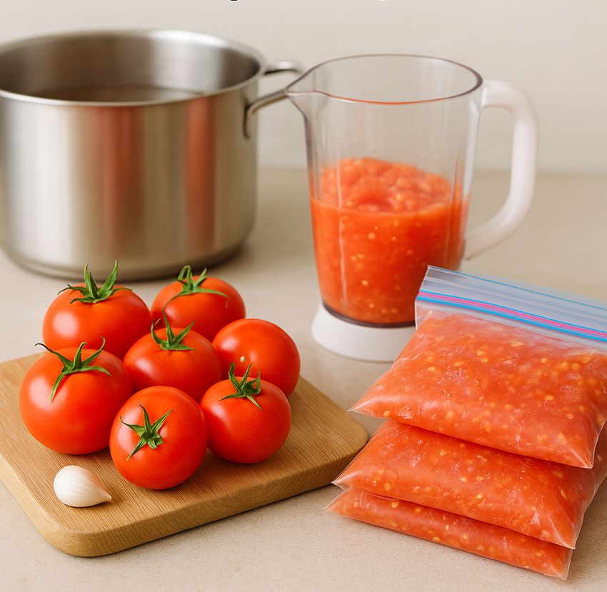 Colocá los tomates ya procesados en bolsas para freezer o en recipientes herméticos. Si te gusta, agregales un poco de ajo picado para más sabor.