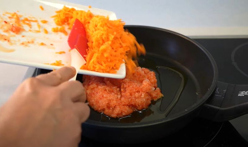 -Sofreír las Verduras: En una sartén con un poco de aceite de oliva, sofríe la cebolla picada, el pimiento rojo y la zanahoria rallada hasta que estén blandos.