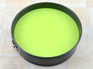 7. Coger gelatina de kiwi y cocinar según las instrucciones del paquete, reduciendo la cantidad de agua en 100 ml. Deje que la gelatina se enfríe, saque el bizcocho y vierta la gelatina de kiwi sobre la capa de cuajada congelada y crema agria. Luego, coloque el pastel terminado en el refrigerador por otras 4-5 horas para que todas las capas estén completamente congeladas;