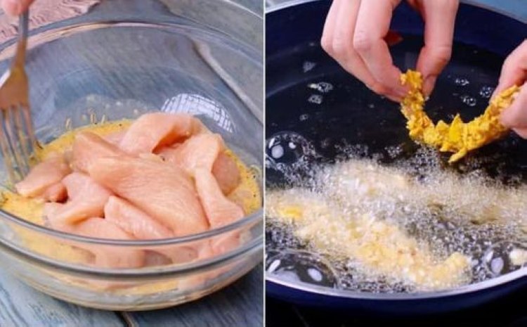 - Luego, sumerge la tira de pollo en los huevos batidos.