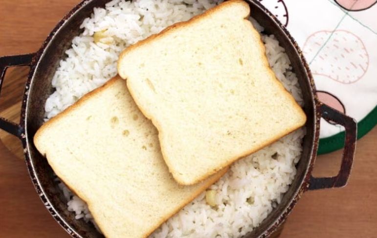Una vez transferido, coloca un trozo de pan fresco en la parte superior del arroz. El pan ayudará a absorber el olor a quemado y suavizará el sabor.