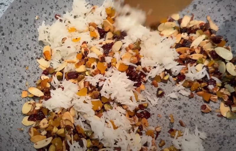 Agrega las pasitas, las nueces, los albaricoques picados, los arándanos deshidratados y la ralladura de naranja. Cocina unos minutos más, removiendo suavemente, para que los sabores se mezclen.